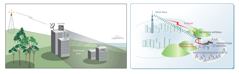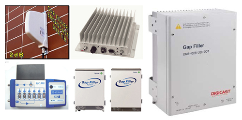 در برخي مناطق كه سيگنال ديجيتال بعلت وجود موانع فيزيكي در دسترس نباشد ، لازم است تا اين سيگنال تقويت يا رله شود . اما براي كاهش هزينه ها تنها رله اي نصب مي گردد كه كانالهاي ورودي و خروجي آن همسان هستند . به اين رله ديجيتال ، گپ فيلر يا پر كننده شكافها مي گويند . البته در استفاده از گپ فیلر ها در سیستم SFN باید سیگنال این دستگاهها با فرستنده اصلی همزمان گردد که این همزمانی از طریق پالسهای GPS تامین می گردد ( بزودی اطلاعات تکمیلی افزوده خواهد شد ) .
