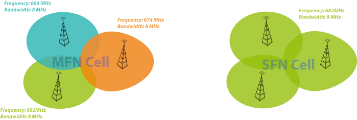 اما در سيستم ديجيتال با اعمال سيگنال هاي همزماني به فرستنده ها كه از طريق GPS تامين مي گردند ، مي توانيم از يك فركانس ثابت در محدوده وسيعي استفاده كنيم و تحت شرايطي ، تداخل نداشته باشيم . بدين معني كه بعنوان مثال در سطح يك كشور يك شبكه با يك فركانس ثابت پخش مي شود ( مثلاً شبكه هاي اول ، دوم ، سوم ، چهارم ، خبر و آموزش ) و ديگر مجبور به تنظيم مجدد گيرنده نيستيم . به سيستمي كه از يك فركانس ثابت بهره مي برد SFN Single Frequency Network مي گويند و سيستم چند فركانسي را MFN Multi Frequency Network مي نامند .