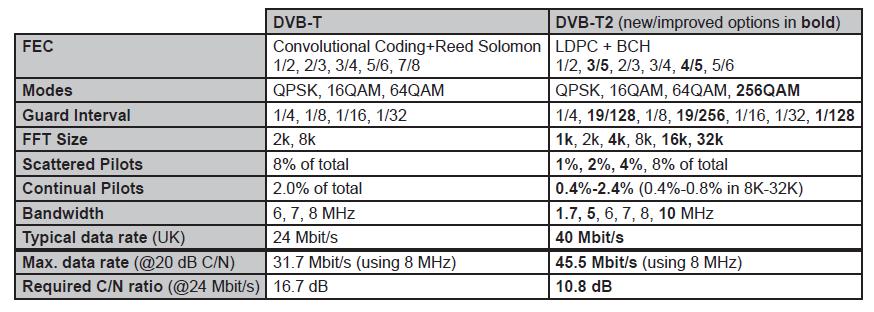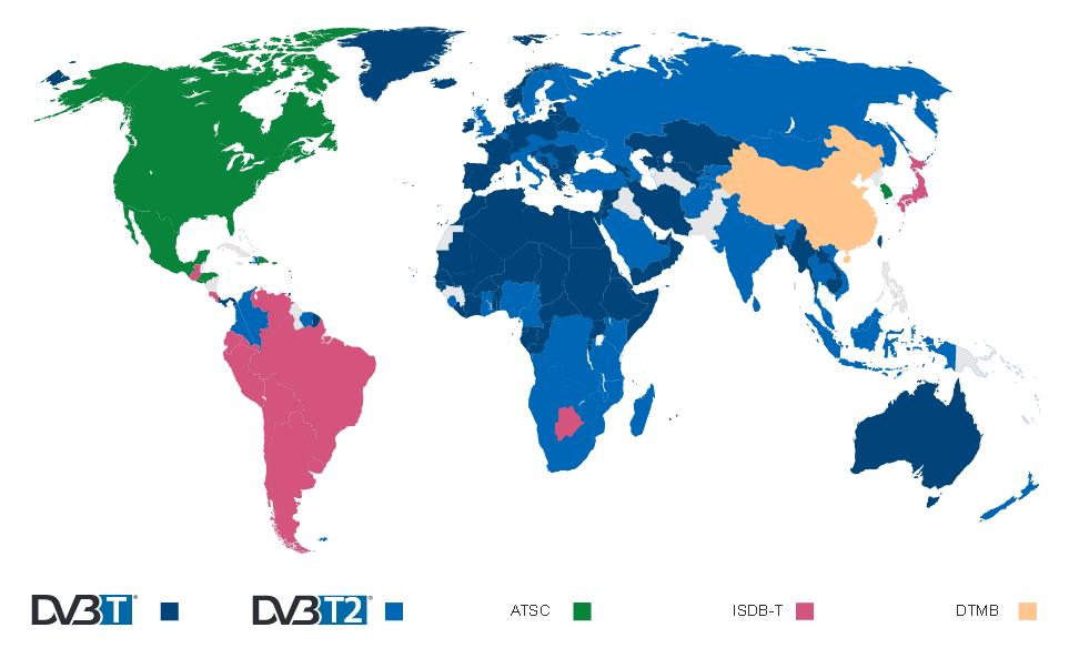 در جدول بالا امكانات اضافه شده در سيستم DVB-T2 را مشاهده مي كنيد . همچنين در تصوير پائين نقشه جهاني كشورها به تفكيك سيستم مورد استفاده ارائه شده است .